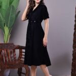 Be the first to review “Women’s Black Velvet Solid Printed Shirt Midi Dress with Belt”