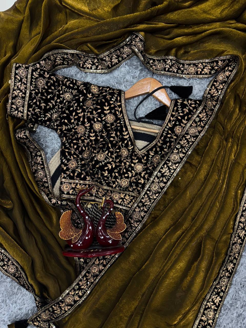 Pure silk saree with sequins, zari embroidery, lace border, fancy latkan, velvet blouse—perfect for sangeet or cocktail.